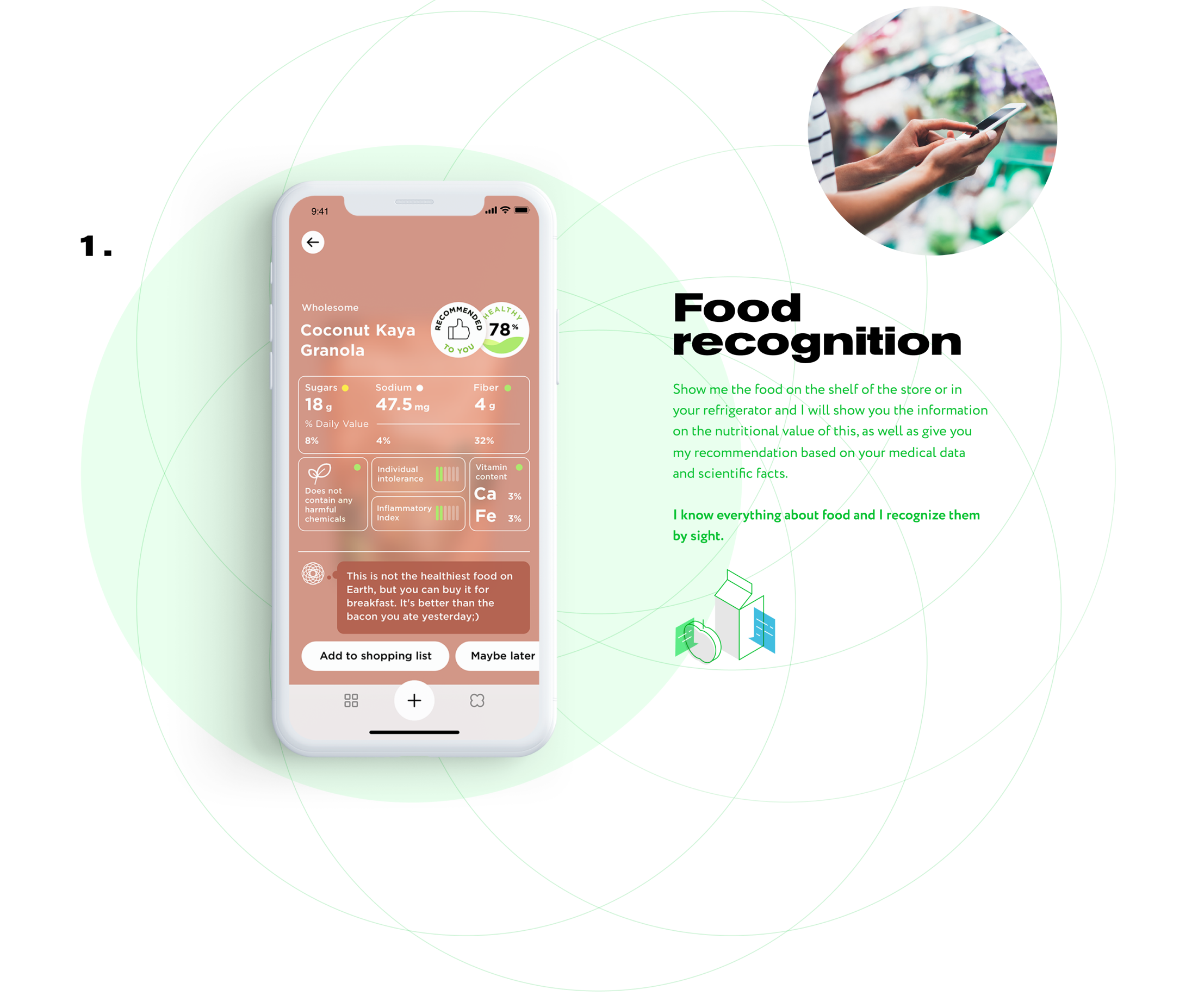 На этом экране интеллектуальный помощник подскажет, стоит ли включать данный продукт в свой рацион или следует поискать замену.