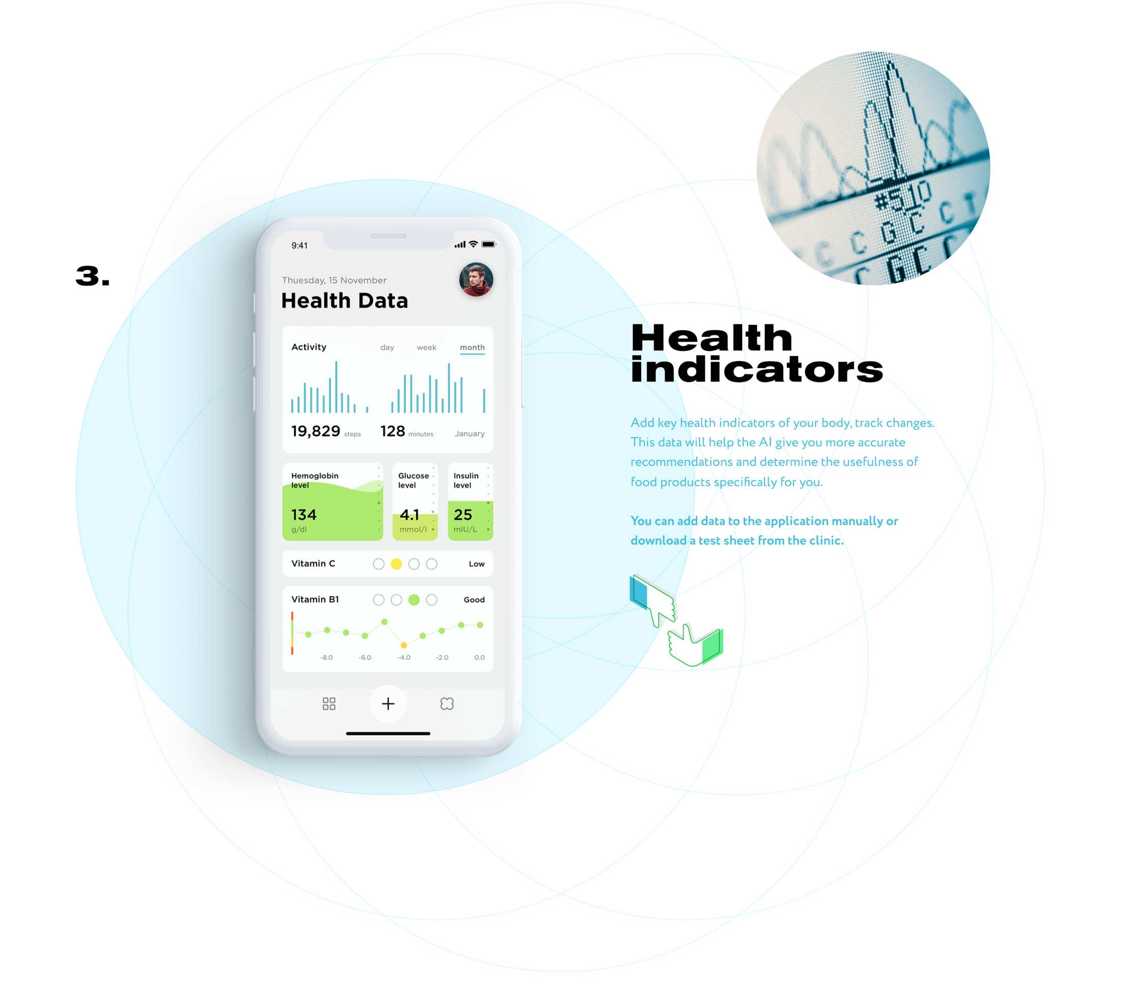 Третий экран – это трекер, на котором демонстрируются данные о состоянии здоровья пользователя. Искусственный интеллект анализирует введенные пользователем медицинские анализы.